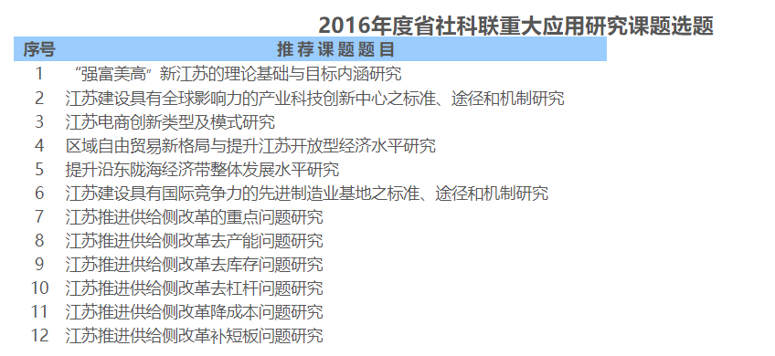 为推动社科研究更好地为省委省政府决策服务,围绕江苏经济社会发展中的重大现实问题,省社科联组织开展由省委省政府主要领导圈定的2016年度省重大应用课题研究。经请示省委宣传部同意,决定采取公开申报、专家评审、省社科联和省社科规划办双立项的形式(本课题属于省级课题)组织开展课题研究。现将申报工作有关事项通知如下: