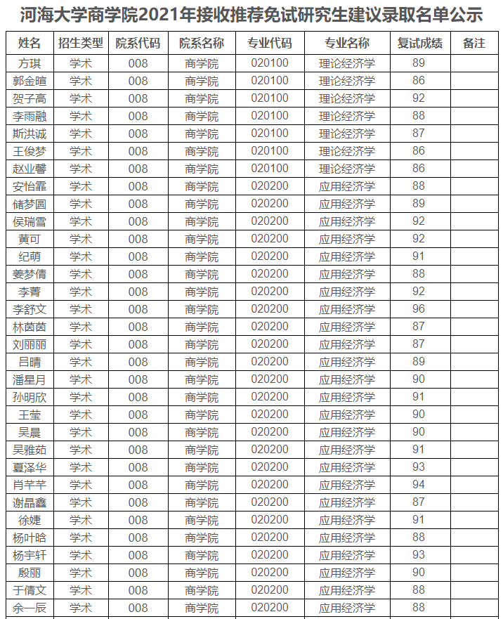 河海大学商学院2021年接收推荐免试研究生建议录取名单公示