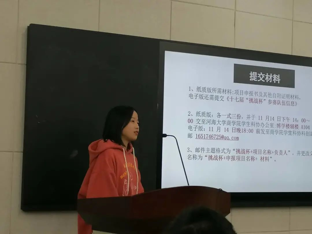 随后商学院学生科协的郑佳慧同学针对大赛要求和本次商学院院内赛流程进行了讲解,向同学们介绍了项目申报注意事项、作品类别、参赛要求和面向对象等。