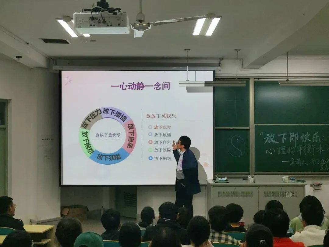 “放下即快乐:心理的平衡之术”讲座在王教授“让昨天成为昨天”的呼吁和同学们的掌声中圆满结束。本次讲座符合当前时期学生的心理需求,教会了同学们如何放下生活中的消极情绪,加强自我的心理调节,培养悦纳自我的态度,以塑造更好的人格品格。希望同学们在今后的学习生活中更加重视心理健康,促进自我的和谐发展,提高人际交往水平和生活质量,并不断提高自身的综合素质。
