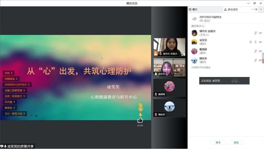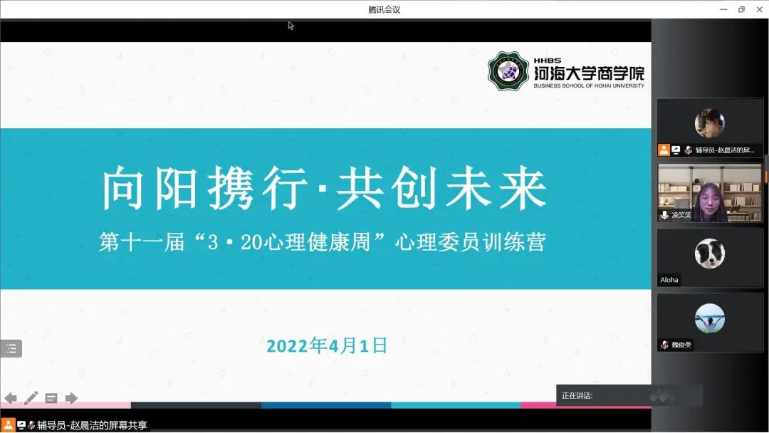 为积极响应河海大学第十一届“3·20心理健康周”主题教育活动的精神,引导同学们树立“珍爱生命、心向阳光、砥砺前行、共创未来”的理念,更好地指导心理委员、宿舍长带领班级学生开展心理健康教育活动,商学院于4月1日下午16时开展了线上心理委员和宿舍长素质能力训练营。本次活动邀请到心理健康与教育研究中心专职心理咨询师凌笑笑老师为主讲嘉宾,学院党委副书记戴媛媛老师和各年级辅导员老师出席本次活动,商学院全体心理委员、宿舍长们共同参与本次讲座。活动由2020级本科生辅导员赵晨洁老师主持。