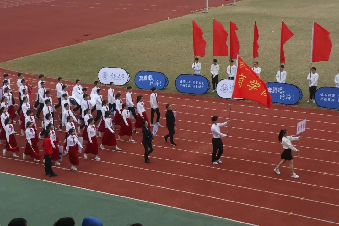 11日清晨,运动会开幕式正式开始,各学院方阵迈着整齐的步伐依次进场,商院学子昂首挺胸、意气风发向主席台迈进,“求天下学问,做工商精英;扬体育精神,创商院辉煌”的口号振奋人心。震撼人心的大型团体操表演开始,同学们青春向上、自信从容,体现了河海新一代“水之子”团结一心和刻苦拼搏的精神。