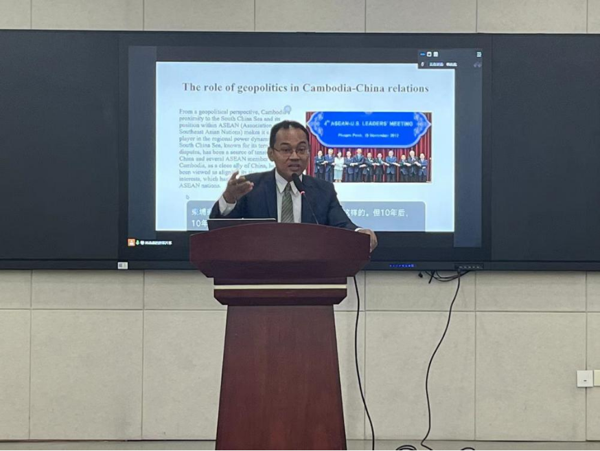 12月2日上午9:30,柬埔寨皇家学院Seun Sam博士于博学楼A100做题为“Navigating the Post-Covid-19 Landscape: Assessing Cambodia-China Relations and Prospects for Cooperation”的报告,报告会由我院张丽娜副院长主持,学院师生共计100余人参加讲座。