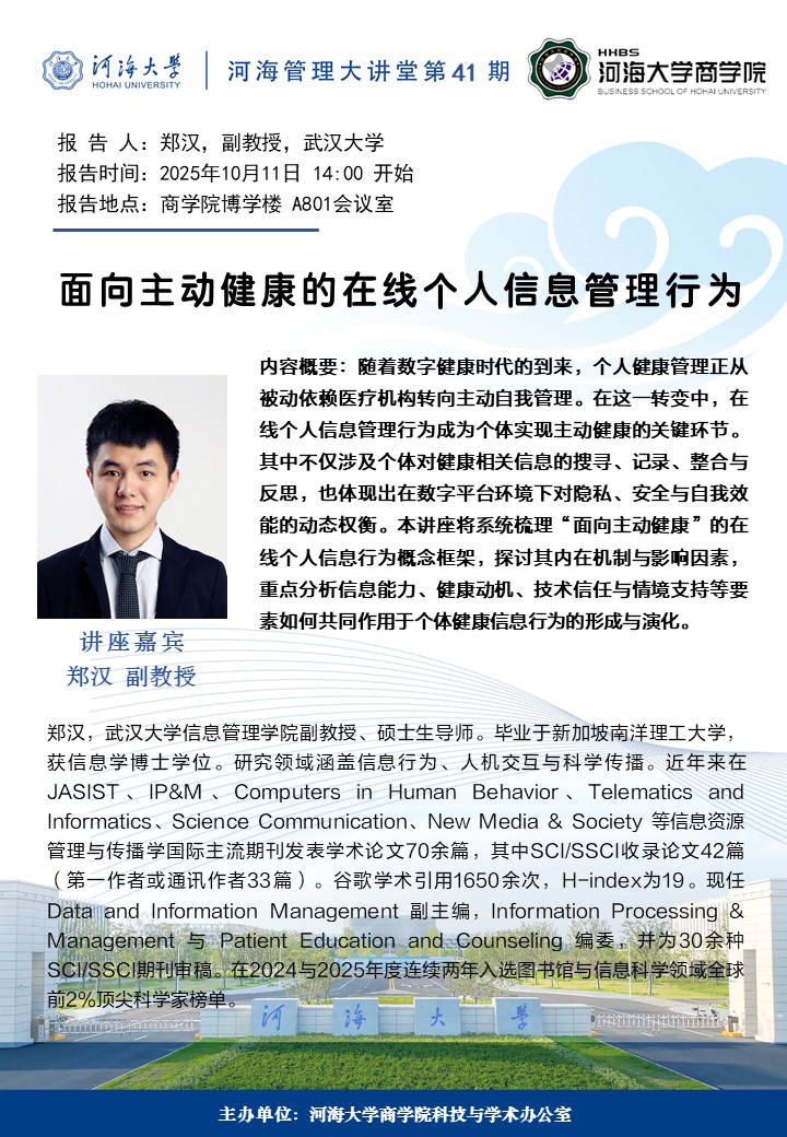 学术讲座通知:面向主动健康的在线个人信息管理行为