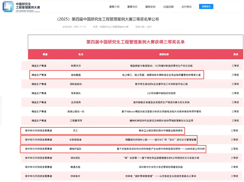 此外,我院工程管理硕士(MEM)四个案例获大赛三等奖,分别是由张可教授指导,陶前林、顾志恒、张顺等同学合作完成的《轨上精工,链上筑基:破解地铁车辆制造企业供应链质量管控的精准之道》案例,获“精益生产赛道”三等奖;由黄晶副教授指导,黄安、赖思航等同学合作完成的《南京江北新区研创园水环境整治案例研究》案例;由陈军飞教授指导,程右东、杨东东等同学合作完成的《唤醒城市的绿色心跳——一座污水厂的“活水”进化论与管理智慧》案例;由李弘扬教授、沈楷程老师联合指导,陆轶君、战文辉、瞿濡岱、黄绍泰同学合作完成的《基于全链条多目标优化的热电联产企业碳中和转型路径研究——以NH热电公司为例》案例。