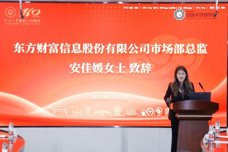 东方财富信息股份有限公司市场部总监安佳媛女士代表协办方致辞。她表示,东方财富始终致力于金融科技的普及与人才培养。通过与河海大学商学院的深度合作,将业界的前沿工具、数据资源与实战经验引入校园,助力新时代大学生将理论知识与市场实践相结合,正是企业践行社会责任的体现。她对大赛中涌现出的优秀投资策略与风险控制案例表示赞赏,并期待未来在校企协同育人方面展开更深入的合作。
