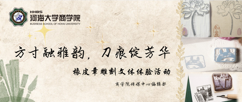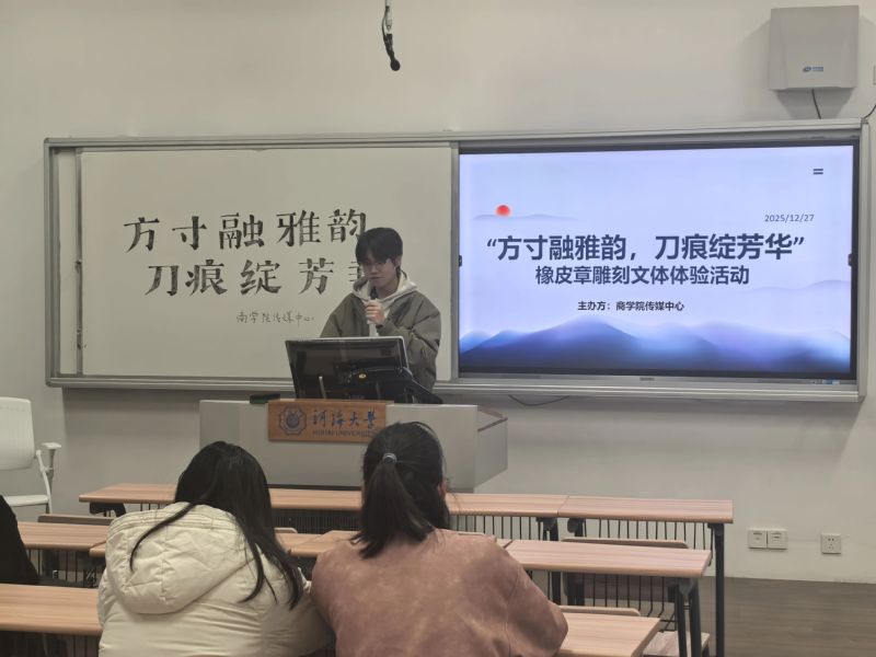 为丰富学生们的课余生活,了解中国雕刻艺术的魅力,传播雕刻文化,2025年12月27日下午,河海大学商学院传媒中心于河海大学常州校区成功举办了面向常州校区商学院全体学生的“方寸融雅韵,刀痕绽芳华”——橡皮章雕刻文体体验活动。本次活动以新颖的形式和轻松的氛围,吸引了众多学生积极参与。